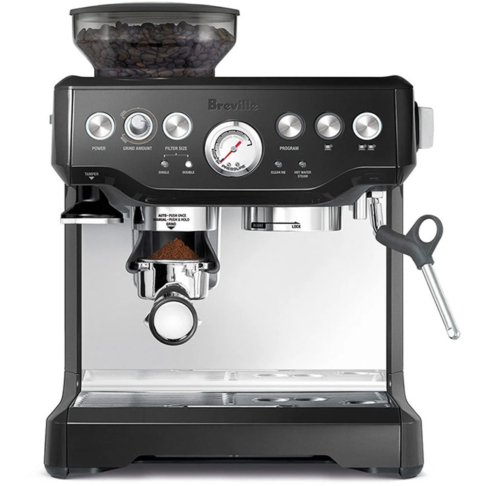 The Breville Barista Express has a modern brushed stainless steel finish. Button and knob-based controls make this an exceedingly intuitive machine. The pressure gauge, mounted on the front panel, is large and simple to read. Overall the Breville BES870XL is built to be a durable, user-friendly machine. The BES870XL has a built-in, stainless steel, conical burr grinder with adjustable grind settings, for your convenience. Choose from a Dual Wall preset grind setting or 15 grind size options to achieve your desired results. Similarly, a knob located on the front panel lets you take advantage of the pre-programmed Dual Wall setting or manually select your grind volume. The removable see-through bean hopper holds 8oz of beans and the burrs are detachable for hassle-free maintenance. This Breville model comes with the following accessories included: Patented Razorâ„¢ dose trimming tool 54mm stainless steel portafilter Single wall filter baskets (1 & 2 cup) Dual wall filter baskets (1 & 2 cup) Coffee scoop Integrated tamper Stainless steel milk jug Cleaning disc and tablets Cleaning brush, tool and Allen key Water filter holder and a carbon resin water filter.