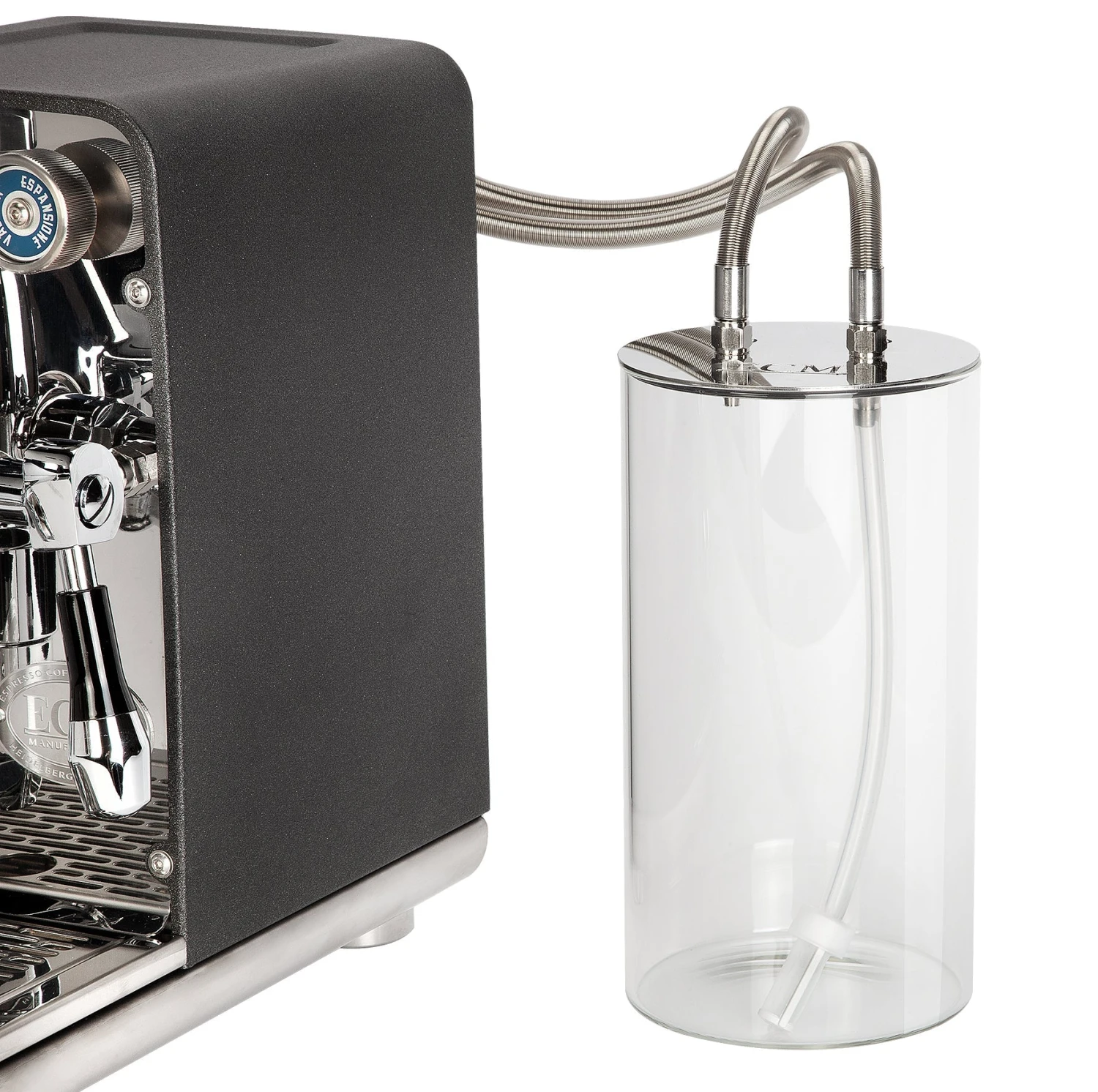 Until you see it in person, it’s hard to overstate just how compact the Puristika is. At just 7.7” W x 13.7” D x 12.4” H, it edges out the Casa V as ECM’s single smallest espresso machine. That said, this was achieved by separating the 2 liter reservoir into a standalone component that connects to the back of the machine. The 4.75” diameter reservoir plumbs in with braided steel hoses and is made from beautiful crystal clear glass.