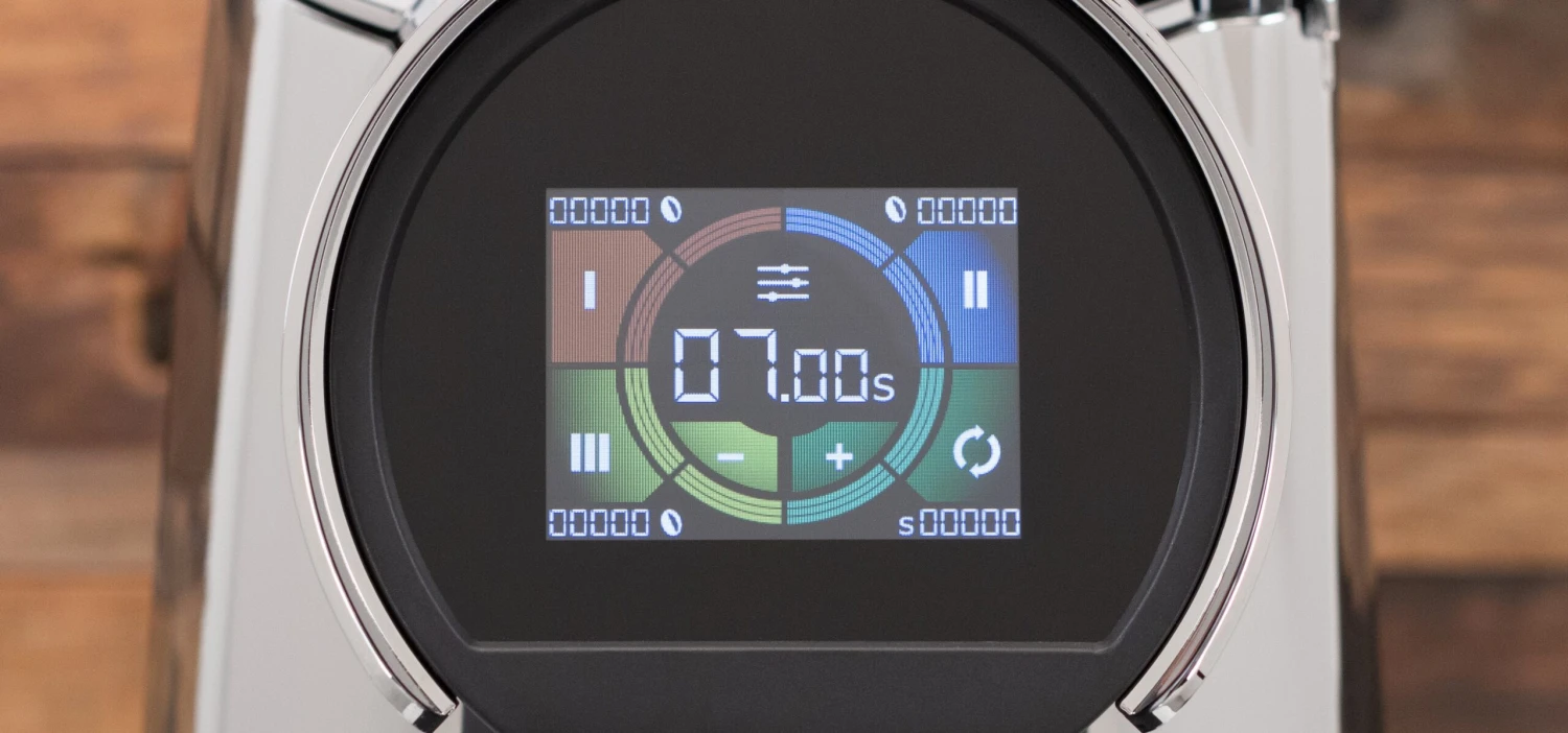 The vibrant touchscreen display makes a statement and offers 3 adjustable timed-grinding presets, as well as an option for manual grinding. Thanks to the touch controls, all adjustments and selections are easy to understand and come naturally. Inside the menus, you can tell the Helios 65 what type of burrs you have installed so that it can notify you when to change the burrs. You can select different colors for the menu as well for a personal touch.
