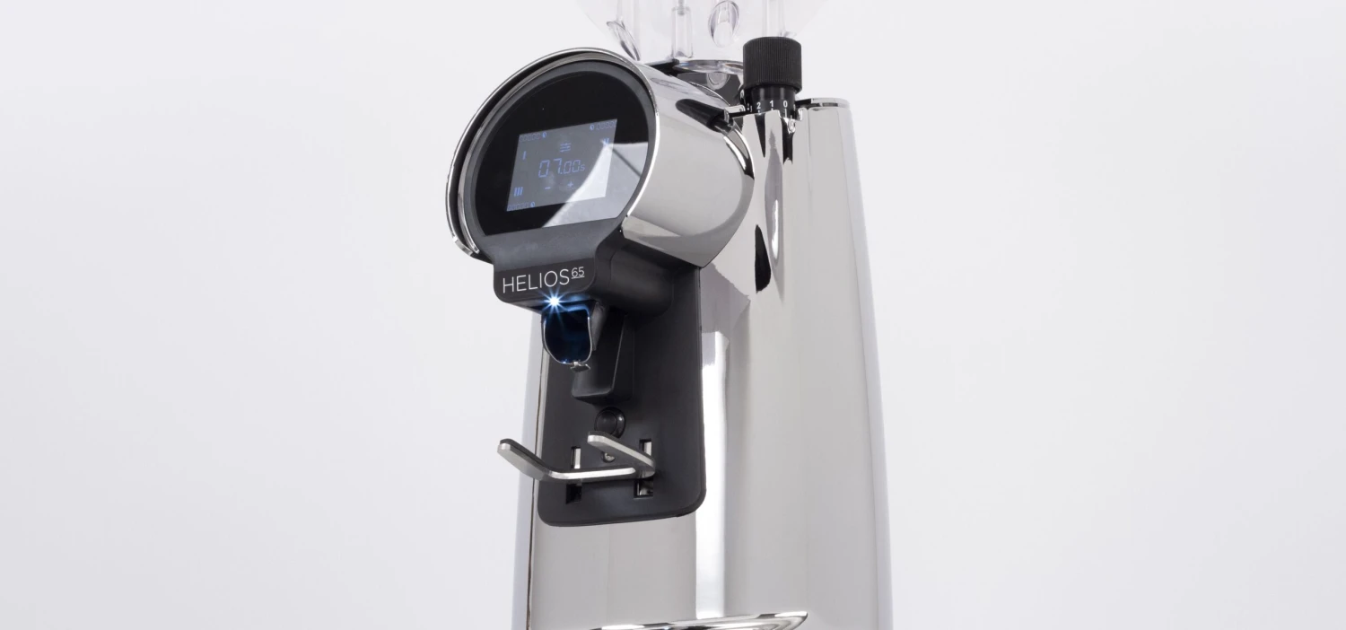 The Eureka Helios 65 is a high speed espresso grinder with intuitive touchscreen controls, 65mm flat burrs, and stepless micrometric grind adjustment. The touchscreen display stores 3 timed-grinding presets, a manual grinding option, and more.