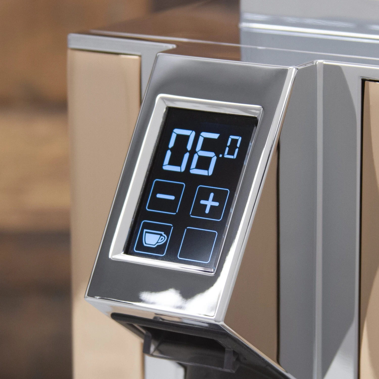 First of all—the touch screen. We’re thrilled with how intuitive it is. It’s vibrant, with a large font size and clean controls. Grind time is adjustable in tenths of a second using the “+” and “-” buttons, and you can freely switch between single and double shots. Also, you can switch to a manual mode for continuous grinding, or lock in your timed settings to keep other people from fiddling.