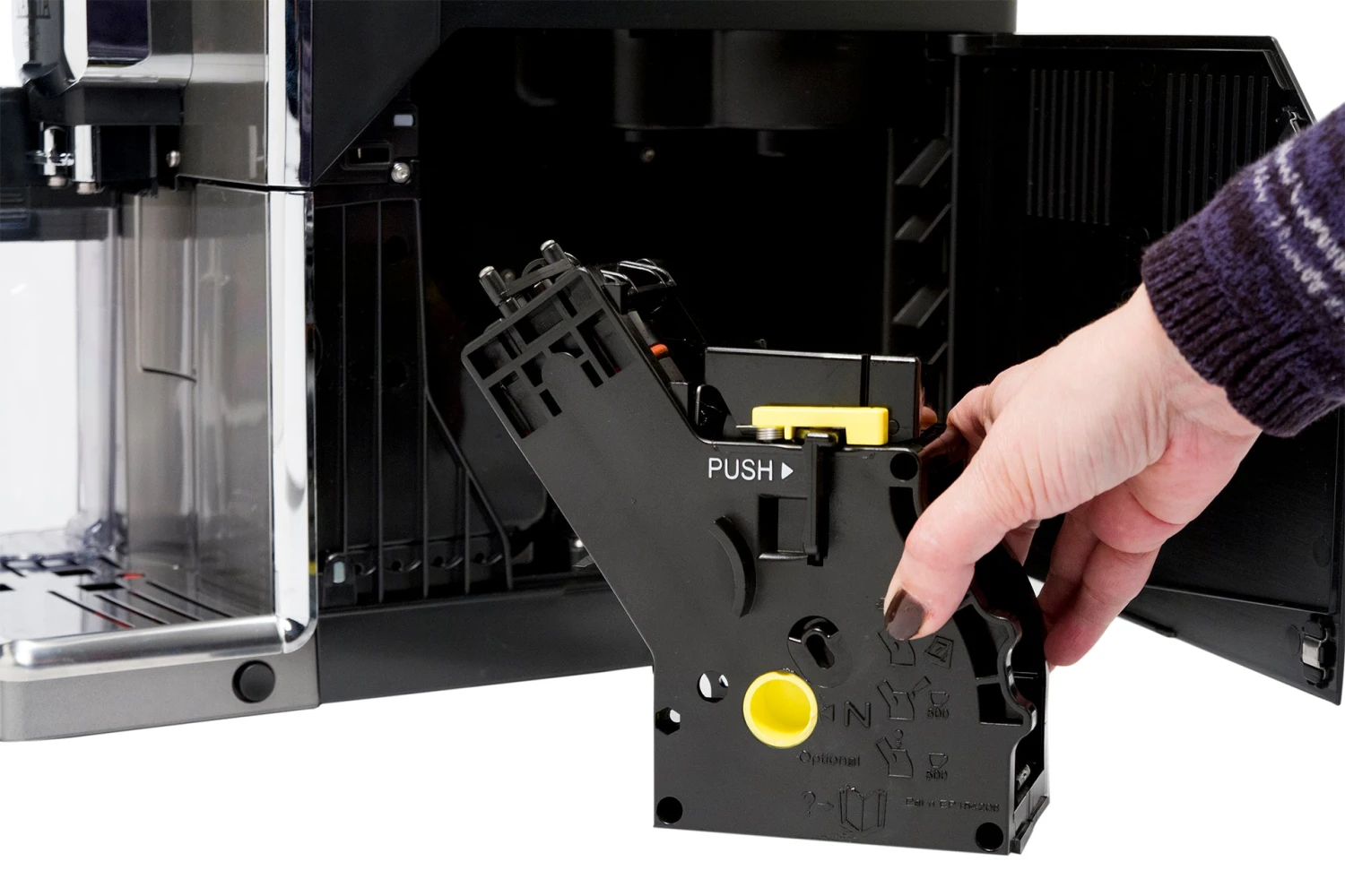 Milk drinks are produced with one-touch thanks to the auto-frothing carafe. With the carafe locked in, the Anima Prestige can produce a cappuccino, latte macchiato, or simply frothed milk at the touch of a button. The carafe inserts into a dedicated socket on the left side of the display and can be removed and stored in the refrigerator when not in use. When the carafe is removed, Gaggia has also included a hot water spout that takes its place and also allows you to dispense hot water for americanos, tea, or hot cocoa. Milk drinks and frothed milk can be customized just like the coffee drinks to your preferred coffee and milk volume.