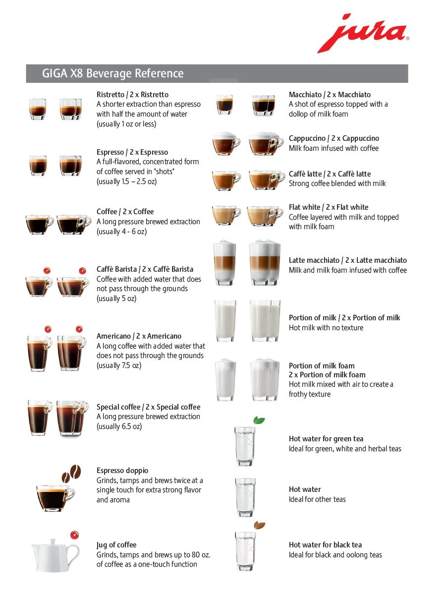 Ristretto, double ristretto, espresso, double espresso, coffee, double coffee, cappuccino, double cappuccino, caffè latte, double caffè latte, caffè barista, double caffè barista, lungo barista, double lungo barista, espresso doppio, macchiato, double macchiato, latte macchiato, double latte macchiato, flat white, double flat white, portion of milk foam, double portion of milk foam, portion of milk, double portion of milk, pot of coffee, hot water, hot water for green tea, hot water for black tea, special coffee and double special coffee.