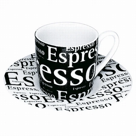 The modern Konitz 3 oz Espresso Writing Cup and Saucer are as bold as your favorite beverages. Available in high-contrast text on your choice of a white or black background, these cups and saucers are microwave and dishwasher safe. The white cup comes with a black saucer and the black cup comes with a white saucer. Both the cup and saucer are made of porcelain.