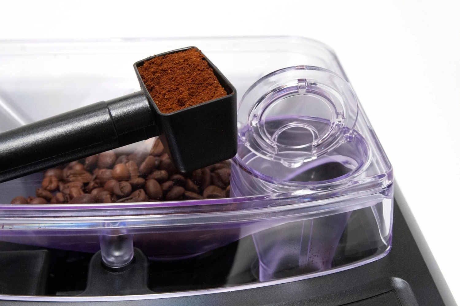 The front loaded water reservoir holds up to 54oz of water and pulls out of the machine for easy refilling. The bean hopper can hold up to 10.58oz of whole bean coffee and you can brew up to 10 drinks before having to empty the dreg drawer.
